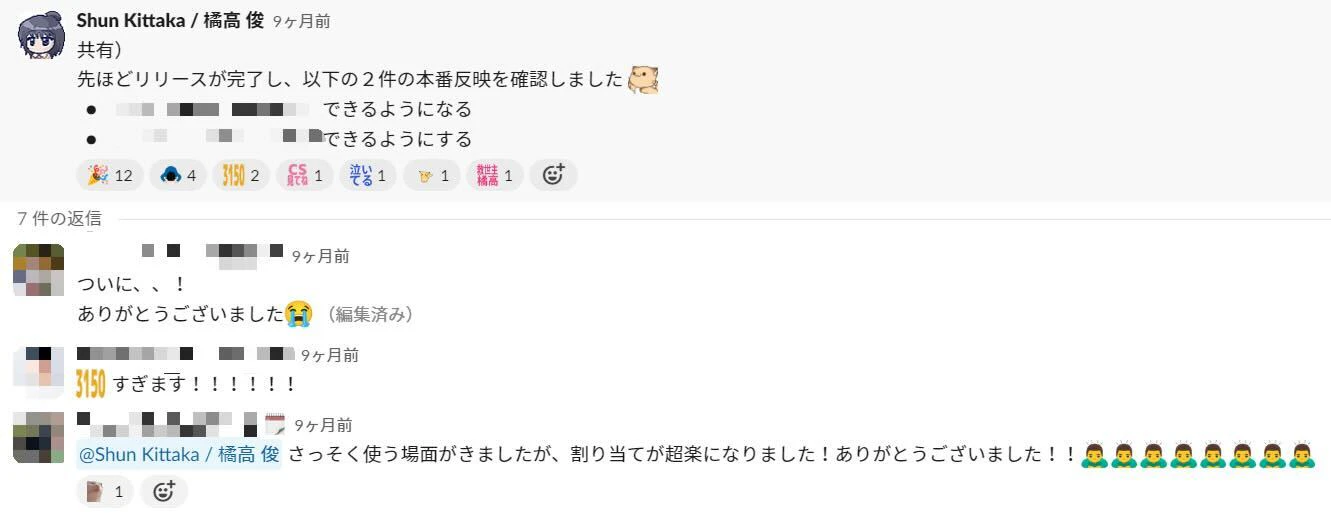 実は橘高は、「SAECO」の進行状況を定期的に社内チャットで発信するようにしていた。「こんなプロジェクトをやります!」という宣言からはじまり、新機能を発表する前には「こんな機能が出たら、めっちゃ幸せじゃないですか!?」と期待感をあおった。そしてもちろん「新機能リリースしました!!」という投稿も常にたくさんの絵文字を付けて、ワクワク感を演出した。ただ単に、プロジェクトを盛り上げようという想いで行なっていたことだったが、それが結果的に社内のみんなを巻き込み、協力してくれるという状況をつくっていった。