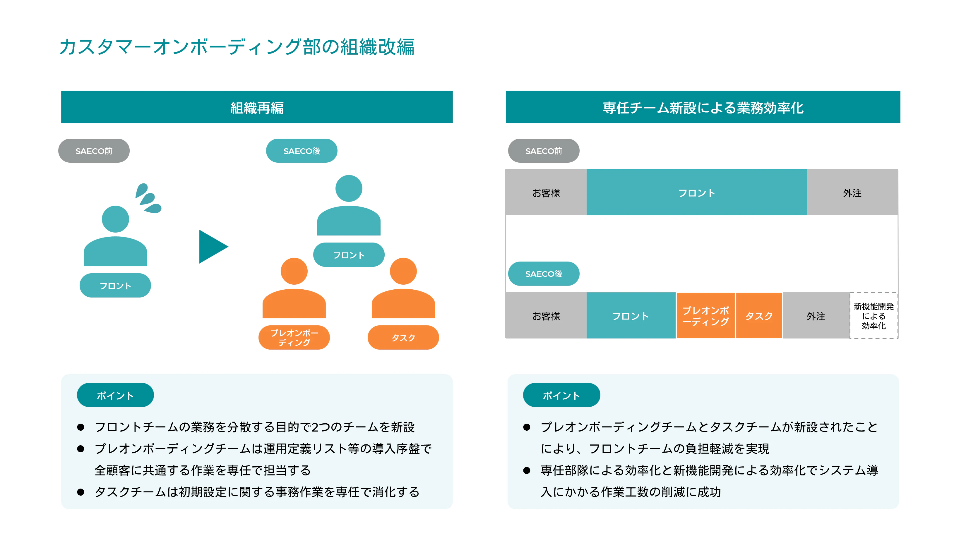 もうひとつの作戦とは、チームの新設とそれによる業務フローの改善だ。これまではカスタマーオンボーディング部の「フロントチーム」に所属する各メンバーが、お客さま1社1社のシステム導入を担当。多岐に渡る導入業務をほぼすべてワンストップで行なってきた。